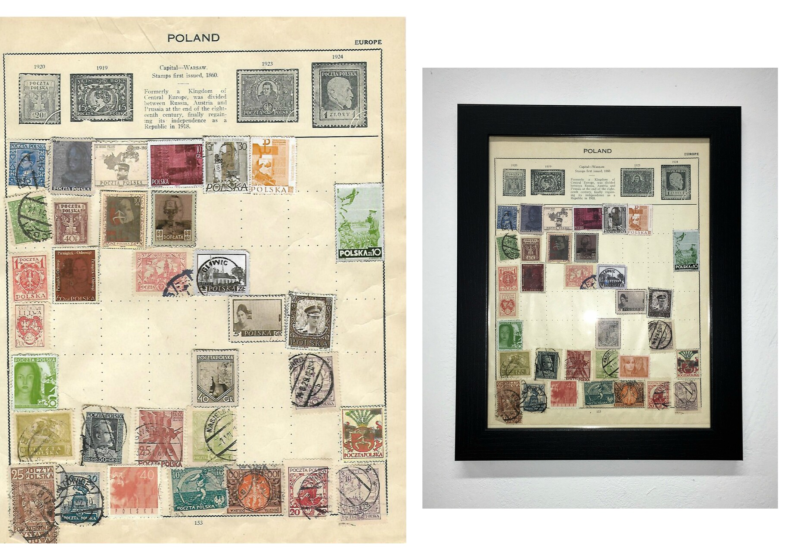 It is a stamp page from a collection book, with a mixture of original polish stamps and the stamps I have created myself. Each stamp produced by me has a different artwork contained within it. Several stamps tell the story of the events of the Second World War, when Germany and Russia invaded Poland, forcing my great-grandmother to go into hiding, moving to a small town called Ropczyce, which is my hometown. Some of the stamps feature the Pieniazek Coat of Arms, exploring the idea of my identity, had I had been born a Pieniazek rather than a Martyniuk. Before Martyniuk, my family's surname was Pieniazek, which came from one of the oldest clan's in Poland's history. As a result of the events that followed WW2, my great-grandmother had to hide her identity, as being found out to carry such a powerful family name, she would have been immediately executed. The surname Martyniuk is also featured in the stamps to honour the memory of my great-grandfather who was part of the Polish resistance movement, during the war - the largest underground resistance in all off occupied Europe.